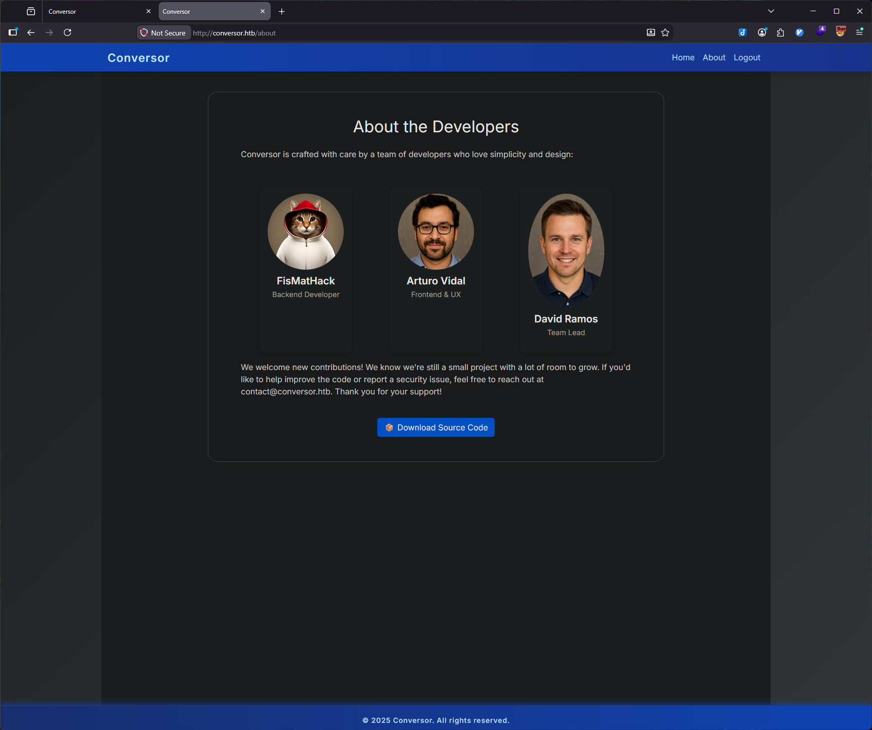 The /about page revealed a critical information disclosure - a "Download Source Code" button that provided complete access to the application's backend implementation.